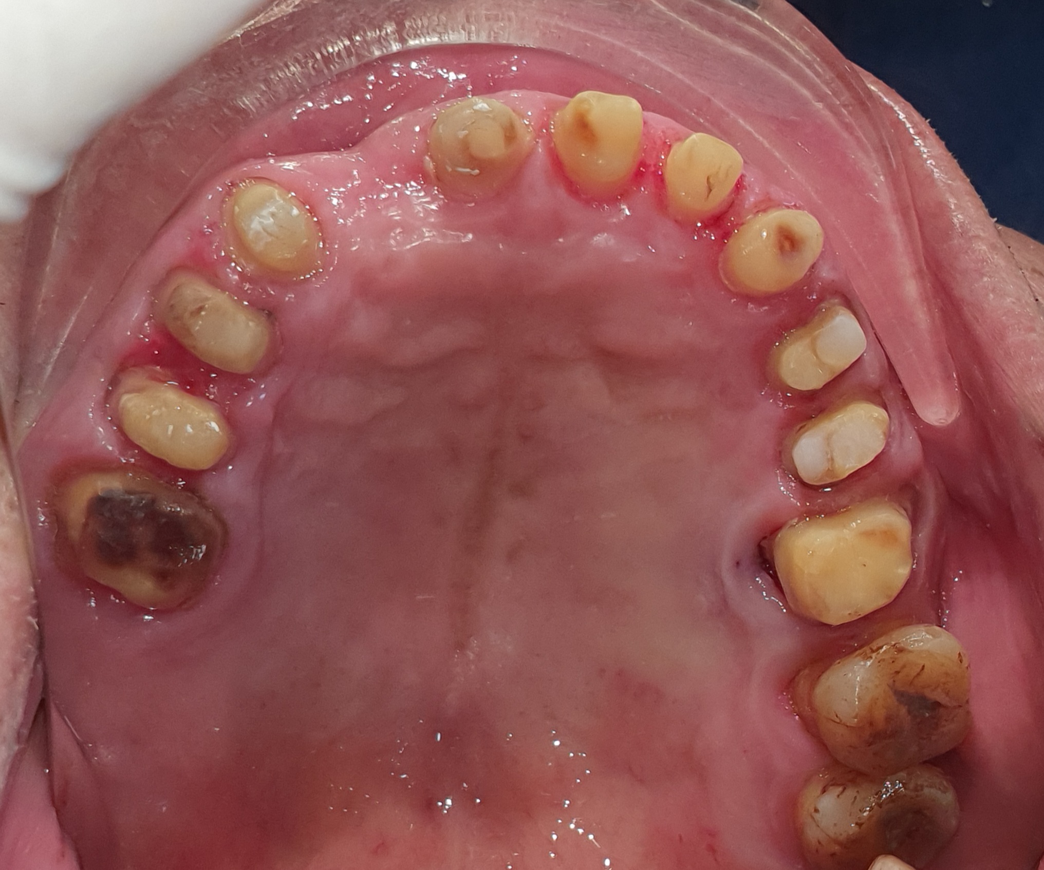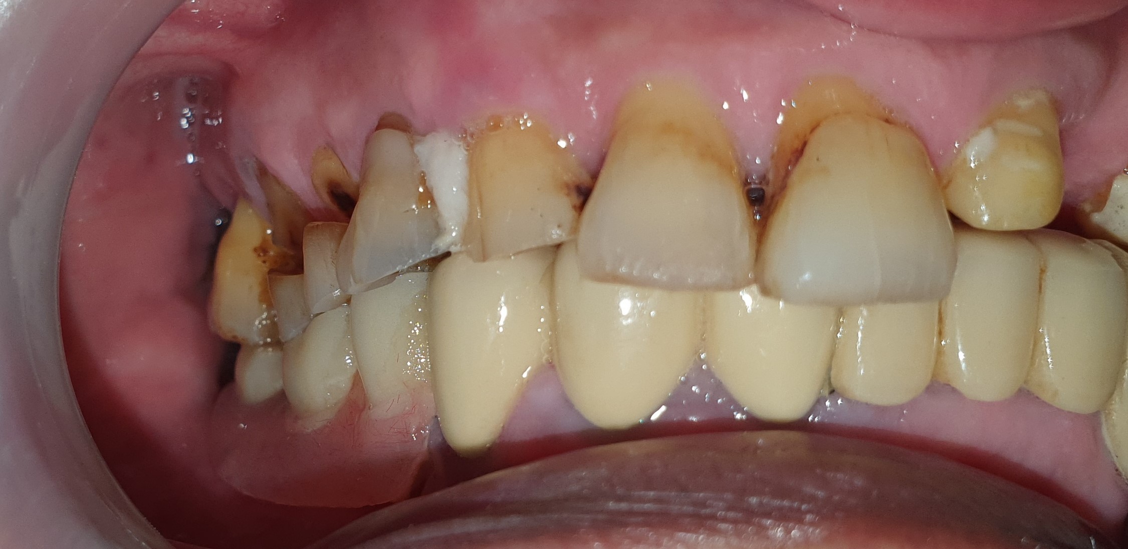 – Răng sứ hiện tại quá to, và thô, làm dính liền tất cả các răng sứ với nhau, rất khó vệ sinh, dẫn đến viêm nướu nặng.