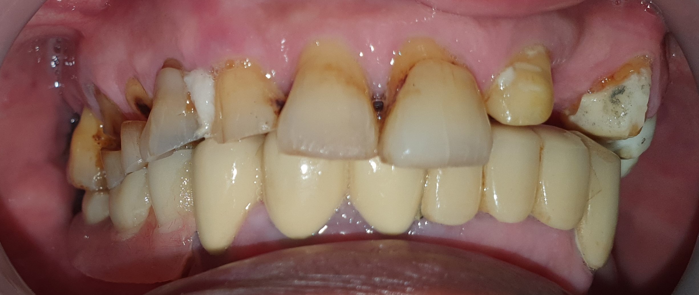 – Răng sứ hiện tại quá to, và thô, làm dính liền tất cả các răng sứ với nhau, rất khó vệ sinh, dẫn đến viêm nướu nặng.